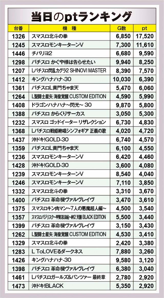 『スマスロ北斗の拳』『スマスロモンキーターンV』から万枚OVERが飛び出し、さらに『チバリヨ2』も万枚に迫るなど、店内は凄まじい熱気が放たれていた。スマスロが大きく盛り上がっていたのはもちろん、『キングハナハナ-30』から6,000枚OVERが放たれるなど、『ハナハナ』シリーズの活躍も見逃せない。何より万回転OVERなどの高い回転数をマークした台が多く、今回の盛り上がりが数字に如実に表れている。