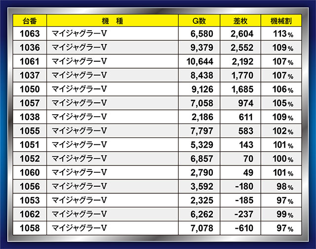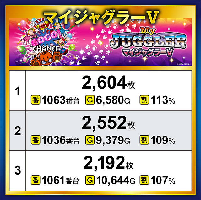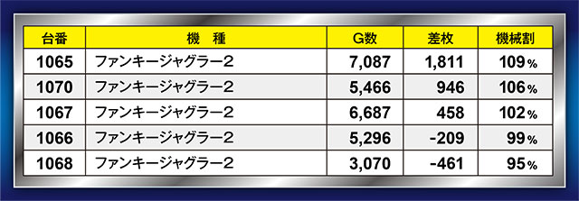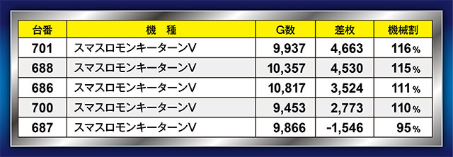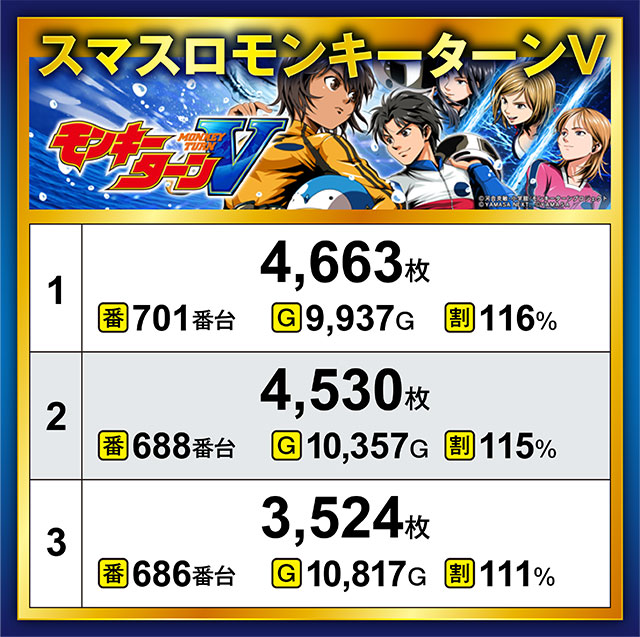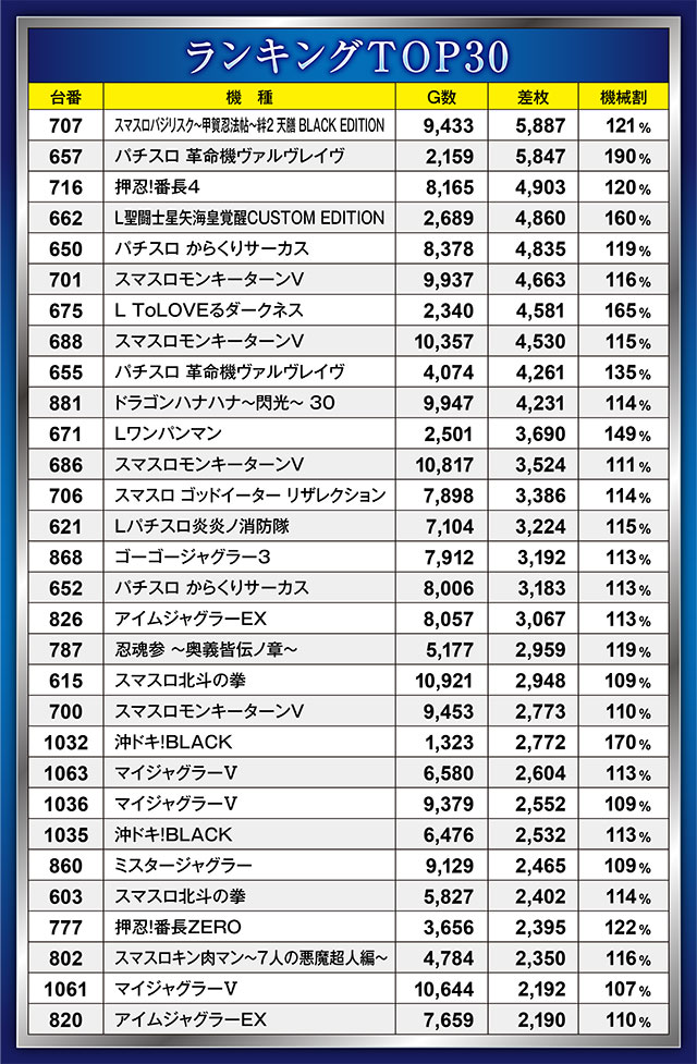 ともに3台がTOP30にランクインしていたのがこの2機種。『スマスロモンキーターンV』は3台ともが110%オーバーを達成し、『マイジャグラーⅤ』は3台ともが2,000枚超え。両機種とも常連さん人気の高い機種だけに、その期待に応えた形となった。