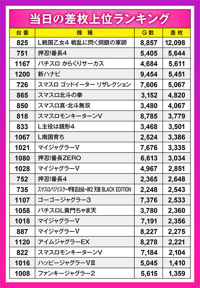 2位以下の記録に倍以上の差をつけ、『L戦国乙女4 戦乱に閃く炯眼の軍師』がこの日の最高差枚記録を叩き出した。2位以下の記録に目を向けると、こういったランキングの常連機種に混じり、『新ハナビ』や新台の『パチスロL黄門ちゃま天』などがランクイン。また『ジャグラー』シリーズも活躍していたようだ。
