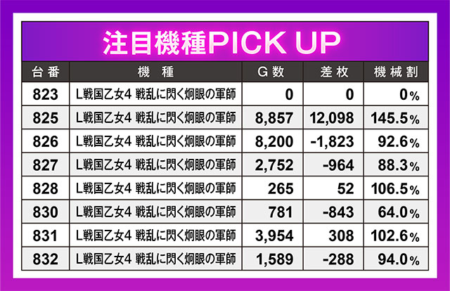 この日の首位レコードとなった825番台の活躍がめざましく、終わってみれば12,000枚オーバー!その機械割は145%を上回っており、優秀台だったのは間違いなさそうだ。それだけにその他の台が総ゲーム数不足と相まって、低空飛行で終わったのは残念だった…。