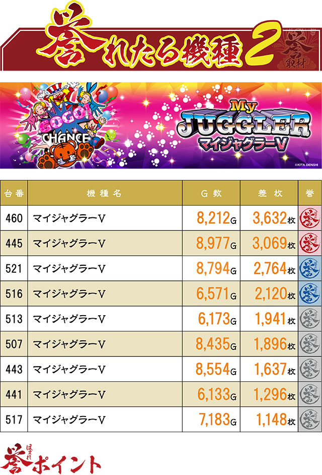 44台設置の『マイジャグラーⅤ』からは、9台の誉マークが出現!特に赤誉&青誉マークの4台は順当にボーナスを引き当て続け、かなり良好なボーナス合算確率となっていた。