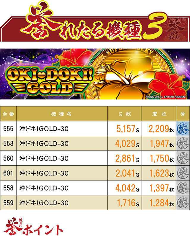 設置の約1/3の台が誉マークだったのは『沖ドキ!GOLD-30』。誉マーク率は上々だったものの、残念ながら赤誉マーク(=3,000枚以上)には出会えず…。次回は赤誉マーキングの出現に期待!
