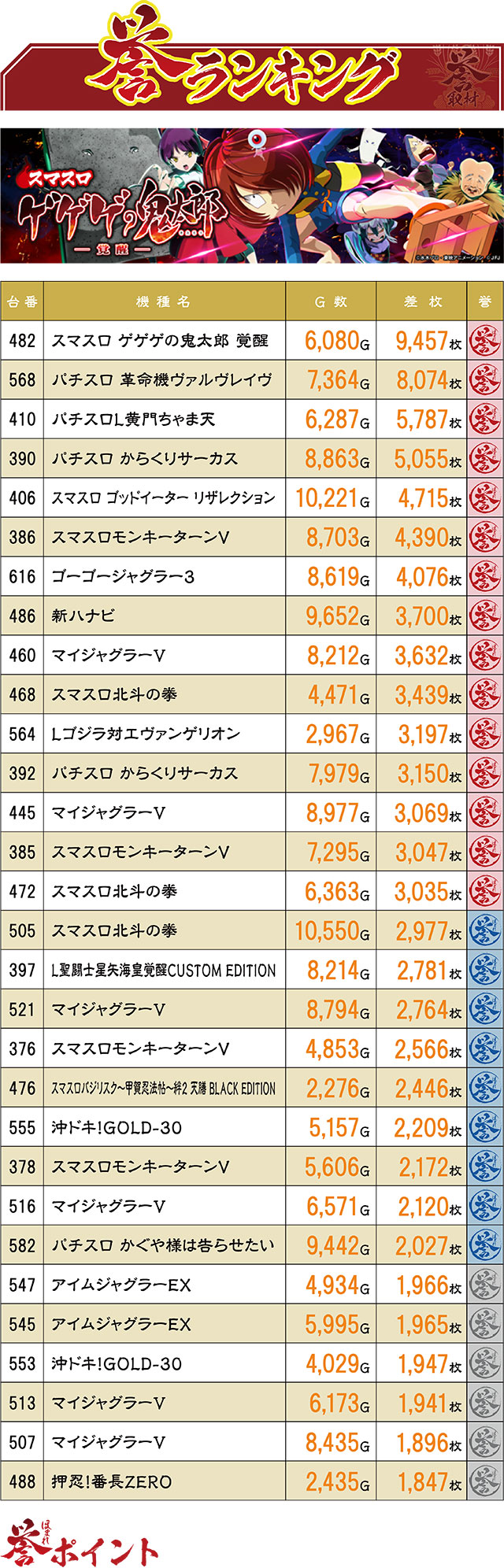 『スマスロ ゲゲゲの鬼太郎 覚醒』が文字通りの覚醒を見せ、9,000枚オーバー記録で首位レコードとなった。さらに2位には8,000枚超え記録で『パチスロ 革命機ヴァルヴレイヴ』がランクイン。この2台が圧倒的な記録で、注目を集めていた。