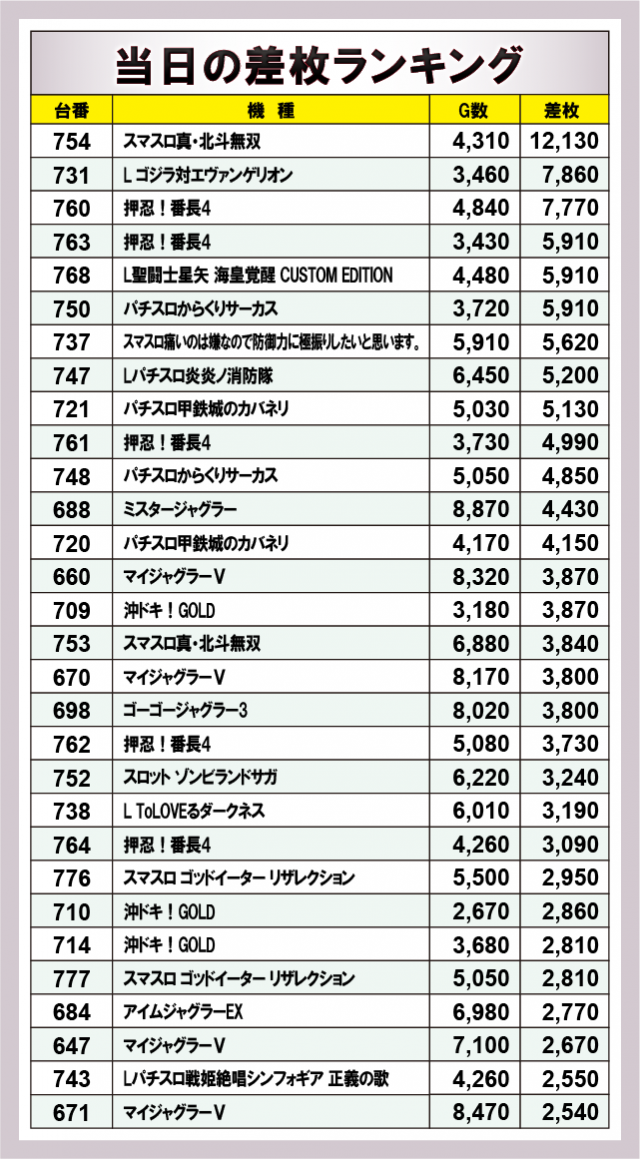 上表の通り、トップ30台は+2,000枚OVER台からとなっており、『スマスロ真・北斗無双』から万枚OVERが発生!さらに『L ゴジラ対エヴァンゲリオン』『押忍!番長4』から+7,000枚OVERが発生するなど、数多くの台がまとまった出玉を確保しており、店内は大きな熱気に包まれていたようだ。