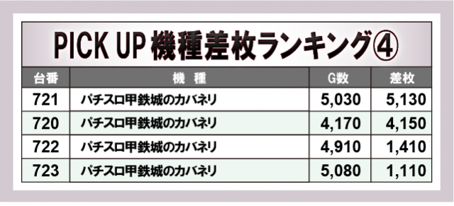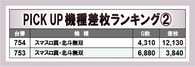 上表の5機種はいずれも安定感のあるパフォーマンスを披露していたことが窺える。万枚OVERを達成した『スマスロ真・北斗無双』を筆頭に、6.5号機不動の人気機種『パチスロ甲鉄城のカバネリ』など、スマスロ機からメダル機まで打ちごたえのある状況が整っていた様子から、これらが館内の盛り上がりに大きく貢献していたと言えるだろう。