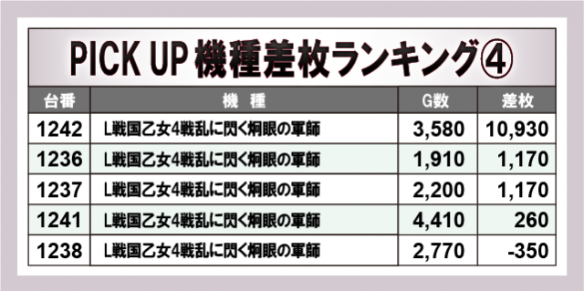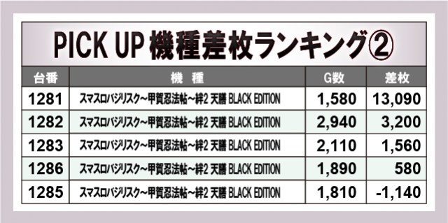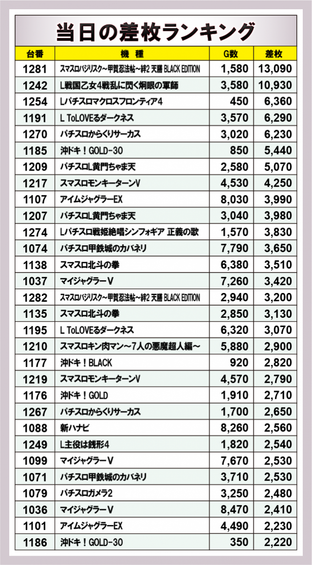 『スマスロバジリスク~甲賀忍法帖~絆2 天膳 BLACK EDITION』『L戦国乙女4戦乱に閃く炯眼の軍師』から万枚OVERが発生!その他にも、『沖ドキ!』『ジャグラー』シリーズが複数ランクインするなど、各所でファンが笑顔を浮かべる光景が広がっていた。