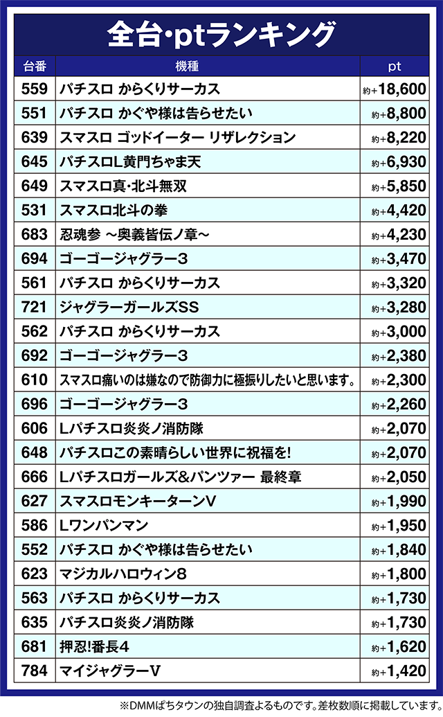 639番台の「スマスロ ゴッドイーター リザレクション」は約+8,220pt、645番台の「パチスロL黄門ちゃま天」が約+6,930ptを記録。