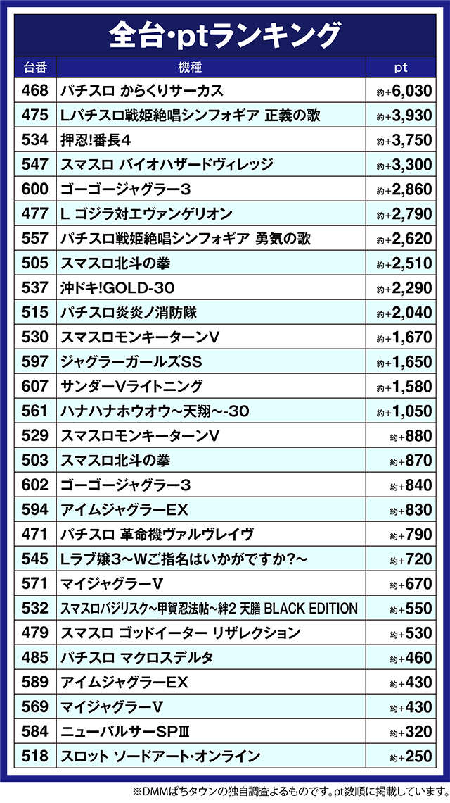 557番台の「パチスロ戦姫絶唱シンフォギア 勇気の歌」と515番台の「パチスロ炎炎ノ消防隊」は、ともに約+2,000pt以上。