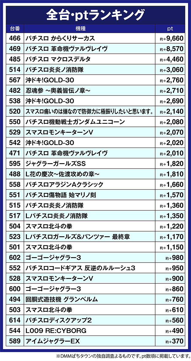 「パチスロ からくりサーカス」も活気は大きく、466番台が約+9,660pt!