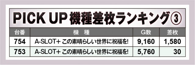 新台『パチスロ かぐや様は告らせたい』『パチスロL黄門ちゃま天』『A-SLOT+ この素晴らしい世界に祝福を!』がさっそく活躍し、上表の通りの結果を残している。同時に『ジャグラー』シリーズの存在感が大きく、いずれもじっくりと打ち込まれるばかりか、867番台+5,960枚や1083番台+4,300枚のように熱を帯びていたのも鮮烈だ。スペック問わず盛り上がっていたと言える内容で、同店の実力の高さが表れている。
