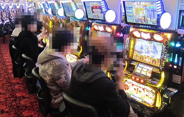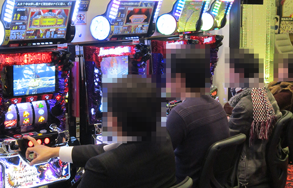 14時をまわった頃の20円パチスロでは、「SLOT魔法少女まどか☆マギカ」が大盛況。盛り上がりが大きいだけでなく、遊技を楽しむプレイヤー全員が朝イチから同じ台を打っていたことも印象的であった。