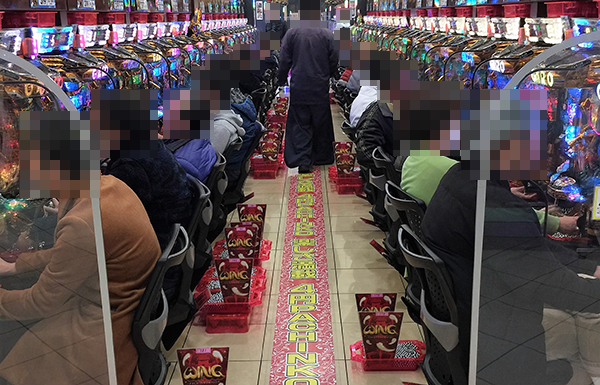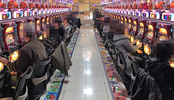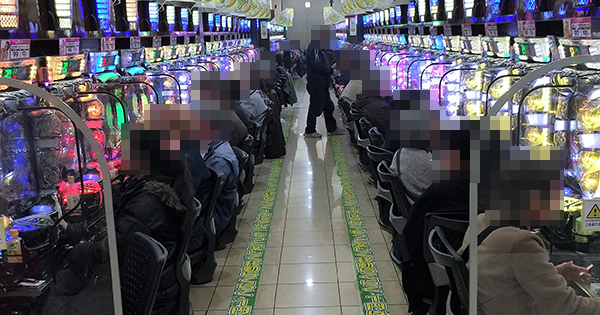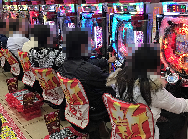 夕方頃の4円パチンコをみると、「CR戦国乙女〜花〜」や「CRぱちんこ GANTZ」といった新台の多くが満席。プレイヤーの明るい笑顔とシマ内に広がる鮮やかな光景が印象的であった。