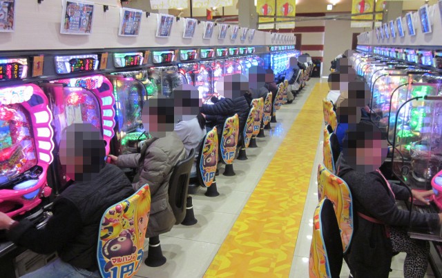 1円パチンココーナーの中でも、特に「CRスーパー海物語IN沖縄4マリンシェルビビッドピンクバージョン」に高齢層を中心に多くのプレイヤーが集まっており、海物語シリーズを並べたシマは大盛況となっていた。