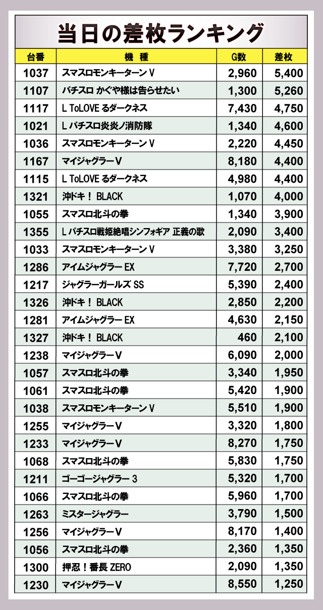 『スマスロモンキーターンV』『パチスロ かぐや様は告らせたい』から+5千枚OVERが発生しており、ほかにも+4千枚OVERを多く確認できる。また、『マイジャグラーⅤ』からも大きな熱気が放たれていたのも見逃せない。大きな熱気はファンを奮い立たせ、その結果としてあらゆる台で終日を通して打ち込まれたようだ。