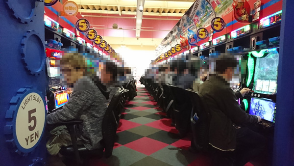 20円スロットコーナーでは、多くのプレイヤーから厚い支持を得ているジャグラーシリーズが人気を集めており、シンプルな告知に一喜一憂する姿を見ることができた。