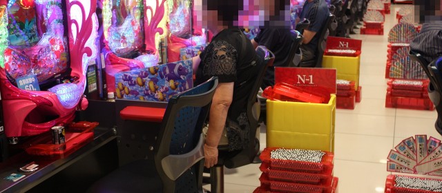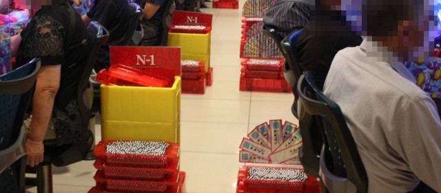 1回目の取材と同じく『Pスーパー海物語 IN 沖縄5』 『P大海物語5』の通路側にドル箱がズラリと並んでおり、好調を維持していた。