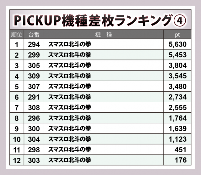 ここ数回で好調が持続していた『スマスロ北斗』20台はこの度も上々。プラスになったのは全体の半数を上回り、4桁プラスの台数も多かった。さらに+5千超×2・+3千超×2・+2千超×2と、『アイムジャグ』以上の躍進を果たした。
