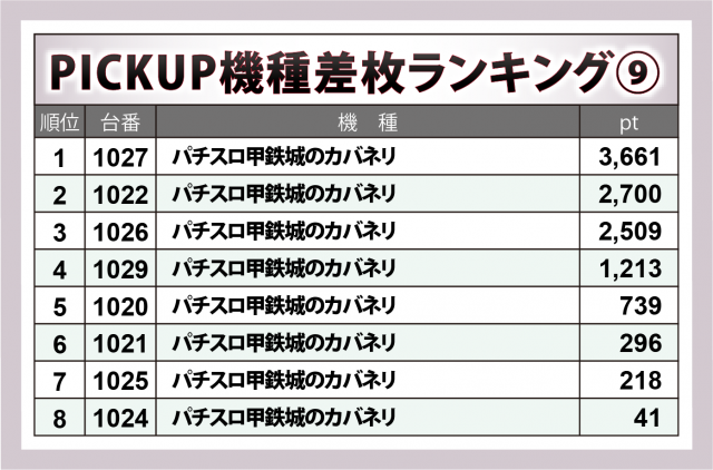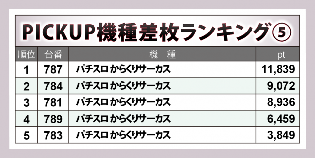 『パチスロ からくりサーカス』9台ではプラスが半数超に達したのに加え全てが+3千8百オーバーのpt数に。787番台が+1万1千8百超というビッグヒットを叩き出した上に、+9千1百弱・+8千9百超・+6千5百弱と、店内最大の盛況に沸いていた。