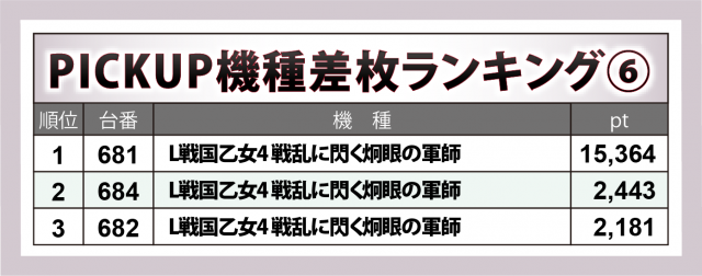 『L戦国乙女4 戦乱に閃く炯眼の軍師』4台では上表の台がプラスとなり高勝率&全て+2千オーバー。その上、681番台が+1万5千3百超と全401台の頂点に輝いた。