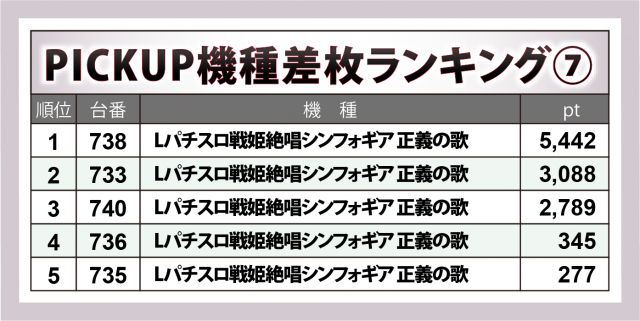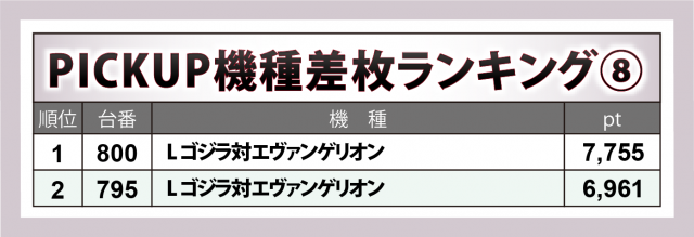『L ゴジラ対エヴァンゲリオン』6台では勝利した台が少なかった反面、+7千8百弱・+7千弱が1台ずつと、ハイグレードが潜んでいた。