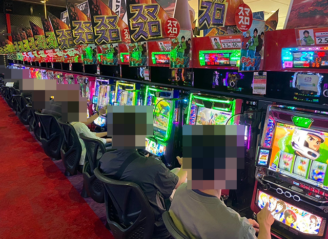 開店直後はパチスロの注目度が高く、スマスロの多くの機種が満席。