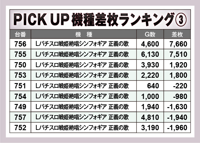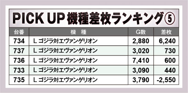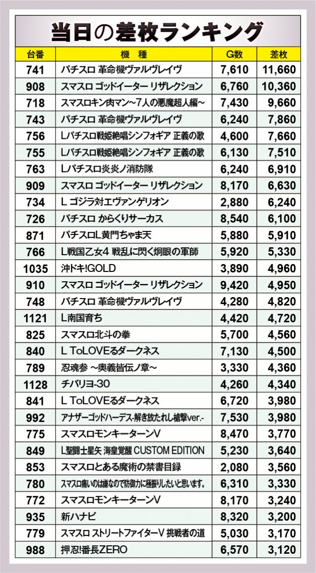 万枚OVERの存在はもちろんだが、『Lパチスロ戦姫絶唱シンフォギア 正義の歌』『L ゴジラ対エヴァンゲリオン』など、各所で大きな熱気が放たれていた。また優秀機種では閉店まで打ち込まれた形跡が顕著で、特に『L ToLOVEるダークネス』『スマスロモンキーターンV』は高い回転数をマーク。上表の機種が中心となって盛り上がりを形成し、ファンに笑顔をもたらしていたようだ。