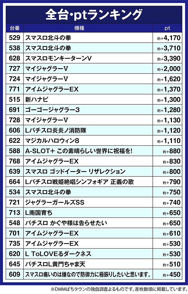 727番台の「マイジャグラーⅤ」が約+2,000pt、771番台の「アイムジャグラーEX」や515番台の「新ハナビ」が約+1,300pt以上となった。