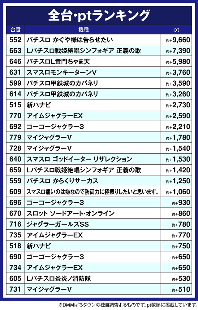 約+9,600ptを超えたのが、552番台の「パチスロ かぐや様は告らせたい」!