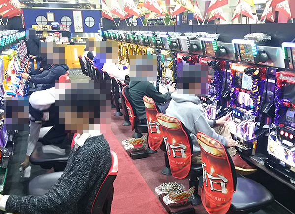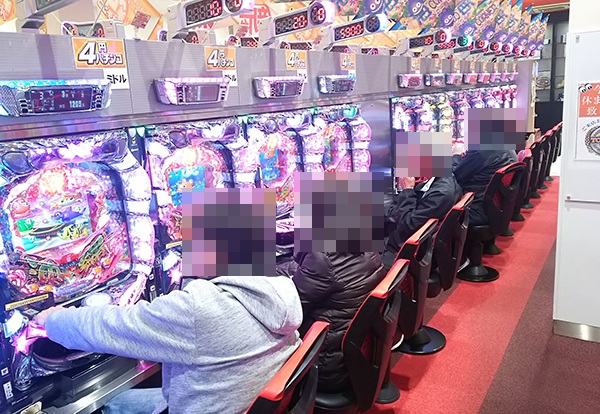 稼働率が高い4円パチスロの雰囲気も明るく、笑顔のプレイヤーが多い。