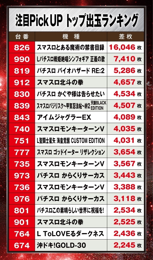 この日の店内状況をチェックしてみると『スマスロとある魔術の禁書目録』が驚異の+16,046枚を叩き出し、ランキング2位の『Lパチスロ戦姫絶唱シンフォギア 正義の歌』を大きく引き離して堂々のトップに輝いた。