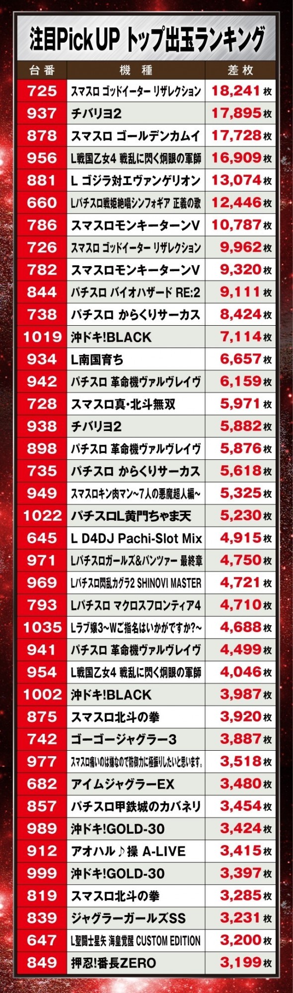 この日は、驚異の+18,241枚を叩き出しランキングトップに輝いた『スマスロ ゴッドイーター リザレクション』を筆頭に万枚超が大量発生!! 『チバリヨ2』と『スマスロ ゴールデンカムイ』も+17,000枚超を記録しており、ベスト3は超ハイレベル且つ大接戦であった。