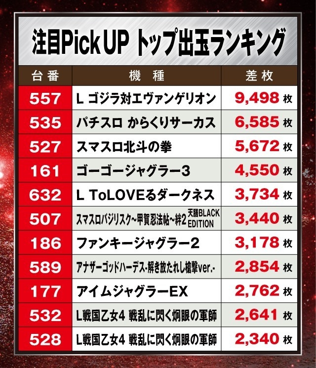 この日の店内状況をチェックしてみると『L ゴジラ対エヴァンゲリオン』が万枚目前の+9,498枚を叩き出しランキングトップに輝いた。さらに『パチスロ からくりサーカス』の+6,585枚、『スマスロ北斗の拳』の+5,672枚と続き、人気のスマスロが上位を占める一日となった。