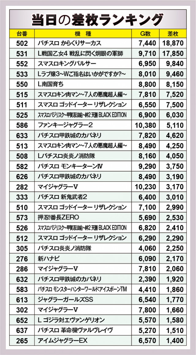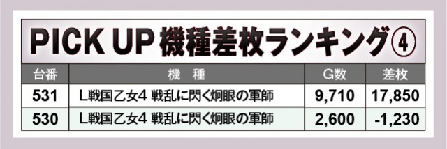 『パチスロ からくりサーカス』『L戦国乙女4 戦乱に閃く炯眼の軍師』から万枚OVERが飛び出しており、さらには『スマスロキングパルサー』『Lラブ嬢3〜Wご指名はいかがですか?〜』から9,000枚OVERと、大きな熱気が放たれていた。さらに大台突破台が多くなっており、より目に焼きつくのは、開店から閉店までじっくりと打ち込まれた台の存在だろう。ファンが確信を持ってレバーを叩いていたのは間違いなく、誰もが有意義な時間を過ごしていたに違いない。