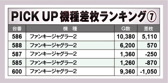 『スマスロ ゴッドイーター リザレクション』は全台プラス差枚数を達成しており、7,000枚OVERという圧巻の熱量も見逃せない。ほかにもAT機群の活躍は鮮烈だが、『マイジャグラーⅤ』『ファンキージャグラー2』の右肩上がりにグラフを描いていた様子も印象的だ。両機種から万回転OVERが飛び出すばかりか、まとまった出玉を確保する光景も見られ、遊技していたファンは口角を緩めながらレバーを叩いていたことだろう。