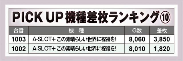 『Lパチスロ炎炎ノ消防隊』『パチスロL黄門ちゃま天』にて8,000枚OVERが2台発生し、ここからも館内の盛り上がり具合が窺える。『A-SLOT+ この素晴らしい世界に祝福を!』では全台プラス差枚数を達成しており、上表の機種はいずれも可能性を秘めていたのが分かるだろう。終日を通して打ち込まれた台もあり、ファンの充実度も高かったと言える。