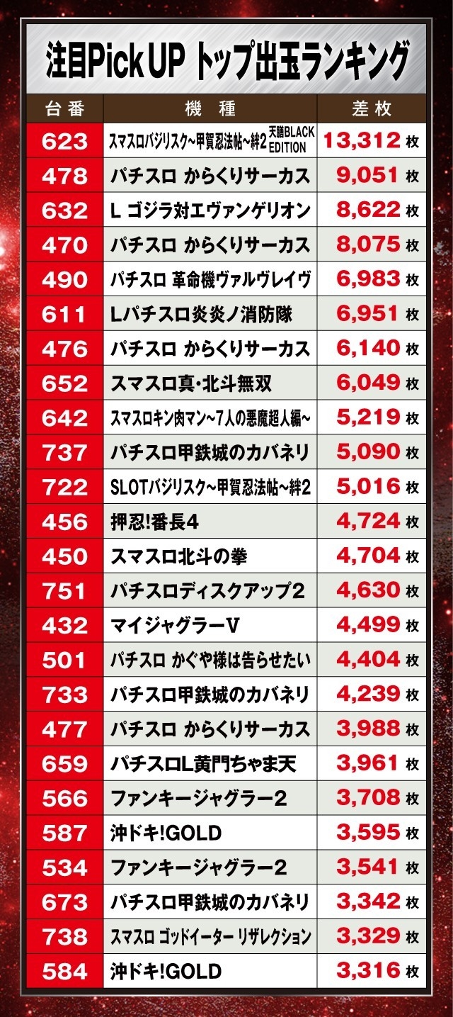 また、『パチスロ からくりサーカス』でも好調台を多数確認、478番台の+9,051枚をはじめ+8,075枚に+6,140枚と複数の台が上位にランクイン。さらに、『マイジャグラーⅤ』で+4,000枚超、『ファンキージャグラー2』で+3,000枚超が2台とジャグラーシリーズも大健闘していた。