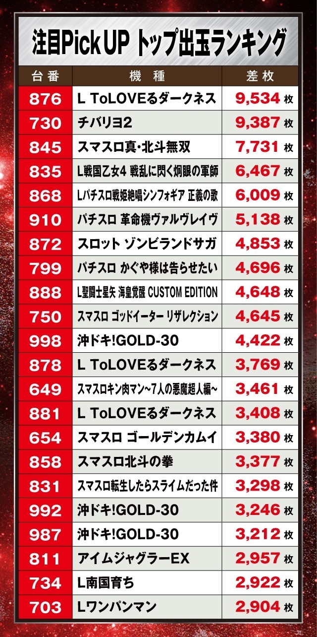 また、その他の機種を見てみると『スマスロ真・北斗無双』で+7,000枚超、『L戦国乙女4 戦乱に閃く炯眼の軍師』と『Lパチスロ戦姫絶唱シンフォギア 正義の歌』で+6,000枚超と、人気のスマスロを中心に大盛況な一日となりファンも大満足だったに違いない。