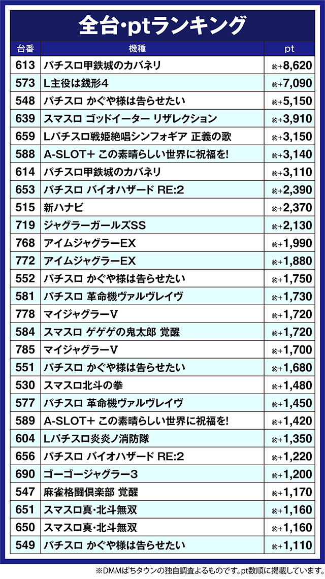 最新機種の盛り上がりも大きく、「パチスロ かぐや様は告らせたい」の548番台が約+5,100ptを上回った。