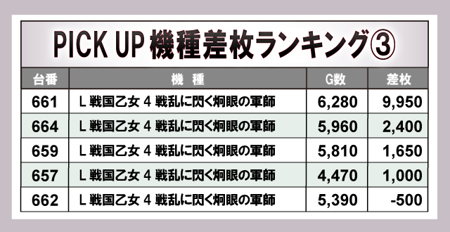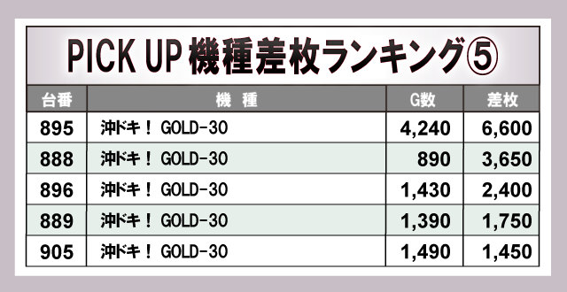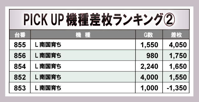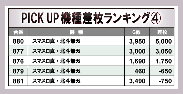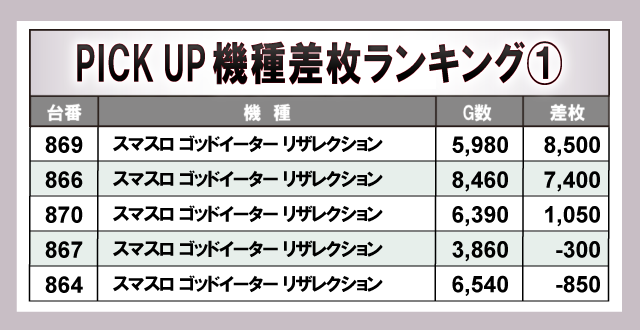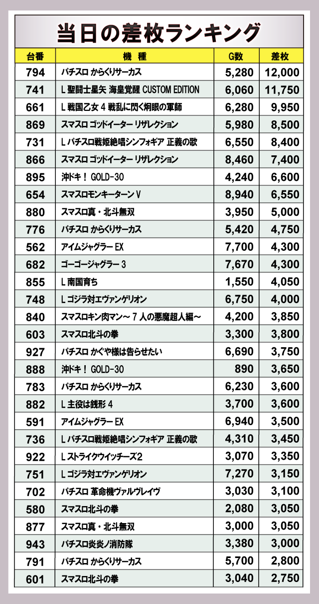 機種単位での活躍を見ると、上表のスマスロ機人気機種たちが大きな活気で店内の盛り上がりをリード。いずれもプラス4桁台が目立っており、コンスタントなボーナス当選を披露していたのが見て取れ、ファンが可能性を見出していた様子が窺える。