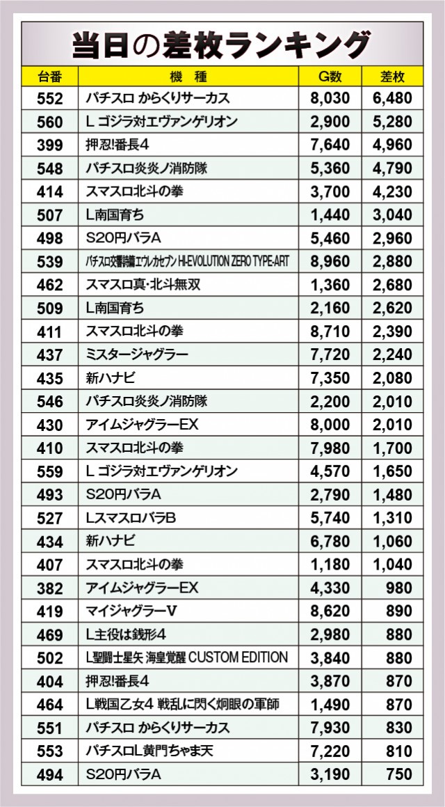 『パチスロ からくりサーカス』から6,000枚OVER、『L ゴジラ対エヴァンゲリオン』では5,000枚OVERと、両台が店内の盛り上がりをリードしていた印象を受ける。そして『押忍!番長4』『パチスロ炎炎ノ消防隊』『スマスロ北斗の拳』は4,000枚OVERと、各所でまとまった出玉を獲得した台を確認できた。ファンはレバーを力強く叩いており、心から遊技を楽しんでいたのは間違いない。