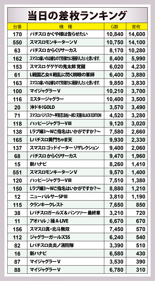 上位30台に目を配ると、30台のうち+1,000overは21台、+2,000枚以上は15台、+3,000枚以上は12台、+4,000枚オーバーは5台、+5,000枚オーバーは4台、そして万枚をクリアしたのは3台と、大収穫の成果となった。