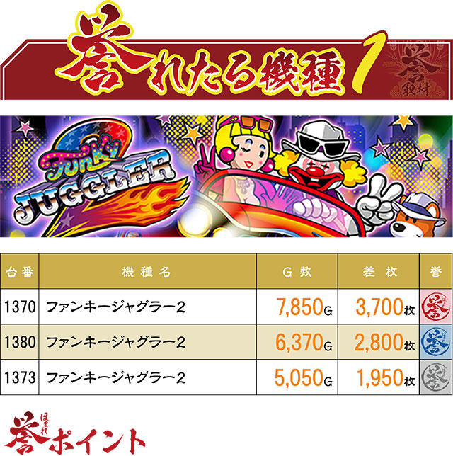 10台設置の『ファンキージャグラー2』は4台がプラス。そのうちの3台に誉マークが付く結果となった。その中で最もGOGOランプをペカらせていたのが1370番台で、3,500枚を上回る結果でジャグファンを沸かせてくれた。