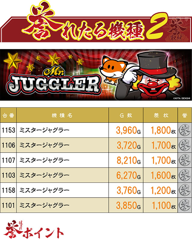 最高差枚記録、誉マークの総数ともに前回(9月15日)よりも格段にアップ!特にメイン機種以外の機種たちの躍動が目立った1日だったようだ。また『ジャグラー』シリーズの活躍もめざましく、相当数のチャンスが潜んでいたのは間違いなさそうだ。