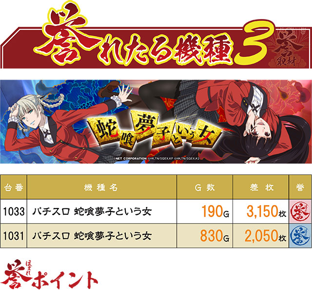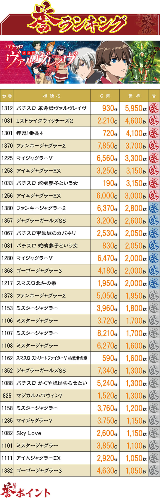 今回の最高差枚記録となったのは、6,000枚近い結果を生んだ『パチスロ 革命機ヴァルヴレイヴ』。驚かされたのは、2位に『Lストライクウィッチーズ2』、7位に『パチスロ 蛇喰夢子という女』、27位に『Sky Love』などのレアなマシンがランクインしていたこと。これはつまりメイン機種以外にもチャンスが潜んでいた証だろう。