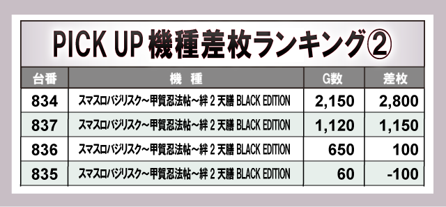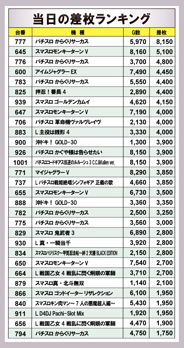 『スマスロモンキーターンV』『スマスロバジリスク~甲賀忍法帖~絆2 天膳 BLACK EDITION』『パチスロ からくりサーカス』から4桁プラス台が複数台発生。これらの機種が盛り上がりに貢献していたと言えるだろう。