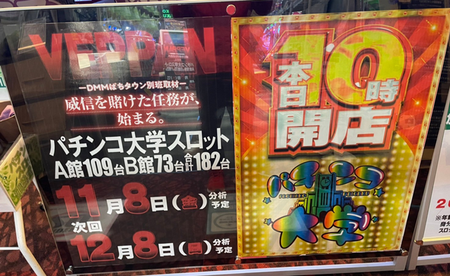 DMMぱちタウン取材班〝別班〟が威信を賭けて執り行う「VEPPAN」が、11月8日に「パチンコ大学」にて実施された。当日は朝イチから31人のファンたちが集まり、取材時はスロットコーナーのアチコチに良台を確認することができた。果たしてどれほどの盛り上がりを見せてくれたのか、ここからはスロット全182台の詳細とともに、当日の店内の盛り上がりをチェックしていこう!