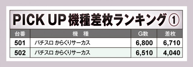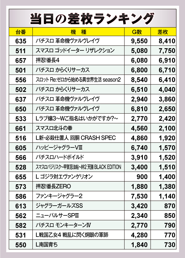まずは当日の差枚ランキングを紹介していこう。22台のうち17台が差枚+1,000枚オーバーで、+2,000枚オーバーは10台出現。それらのなかでもっとも優秀だった台は、635番台の「パチスロ 革命機ヴァルヴレイヴ」で、差枚は+8,410枚を獲得! その他ランクイン機種を見渡すと、最新台や人気機種を筆頭に、多種多様な機種がランクイン。楽しめる環境は店内全体にあったようだ!