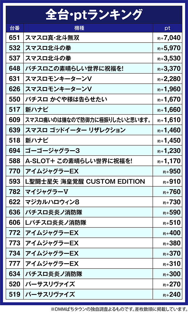 ほかにも、「パチスロ かぐや様は告らせたい」の550番台や「新ハナビ」の517番台などが約+1,500ptを超えた。