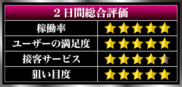 ジャグラーシリーズを筆頭に、「ハナビ」や「バーサス」といったボーナスタイプも明るい雰囲気に包まれていた。