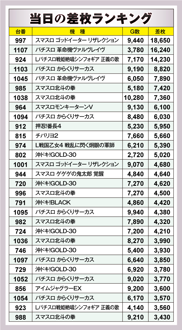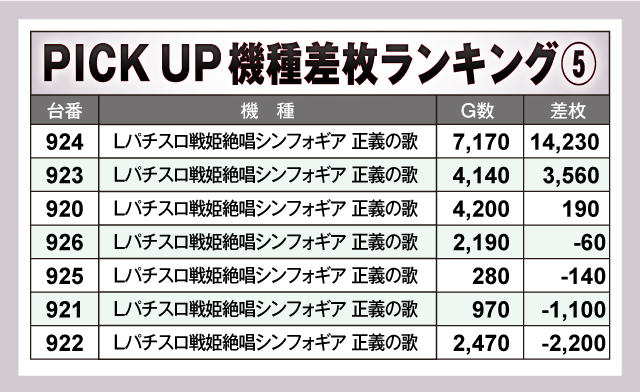 トップ3に輝いたのはいずれも万枚OVERを達成した『スマスロ ゴッドイーター リザレクション』『パチスロ 革命機ヴァルヴレイヴ』『Lパチスロ戦姫絶唱シンフォギア 正義の歌』の3台。さらに、人気スマスロを中心に+5,000枚の大台を突破した台が10台も出現し、ホール内の盛り上がりは最高潮に! 訪れたファンたちは、手応えを感じながら終日遊技を楽しめたことだろう。
